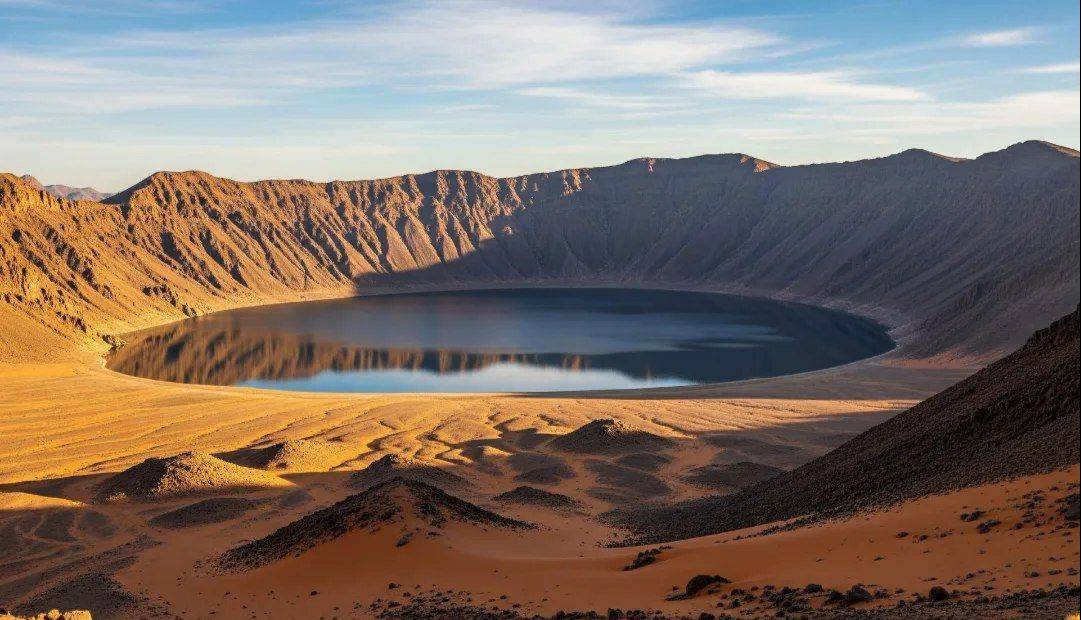 سیاست و بازاریابی - زومیت / تصویرسازی منظره طبیعی و فراواقعگرایانه بیابانی وسیع در صحرای بزرگ آفریقا با نور گرم و طلایی خورشید و یک دریاچه باستانی عظیم دهانه آتشفشان که پر از آب است و توسط کوههای شیبدار احاطه شده است.