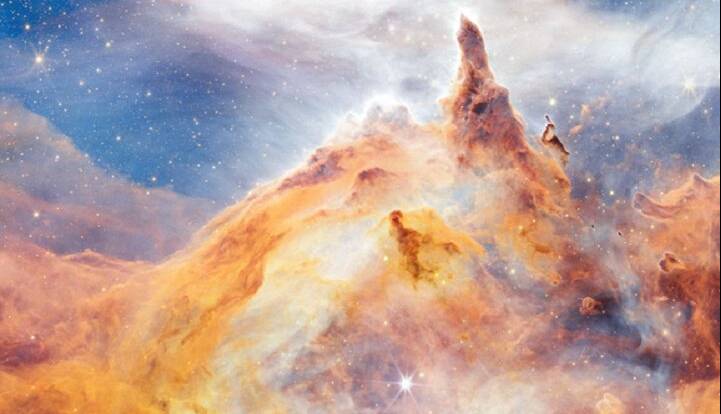ستارههای پرانرژی نزدیک مرکز عکس که در کنار یکدیگر مانند یک کلیسای جامع گوتیک به نظر میرسند، گویی در حال بیرون آمدن و روشن کردن یک پیله تماشایی هستند.