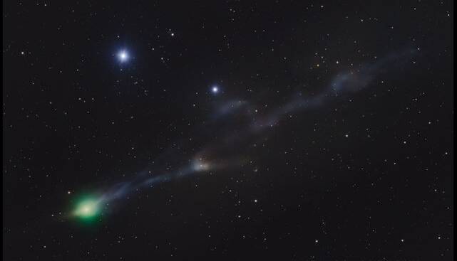 این عکس هفته گذشته از تگزاس گرفته شده است و یک دنباله سبزرنگ، یک دم یونی آبیرنگ سرگردان که احتمالاً توسط باد خورشید ما منحرف شده و یک پاددُم را نشان میدهد که همگی ویژگیهای معمول دنبالهدارها هستند.