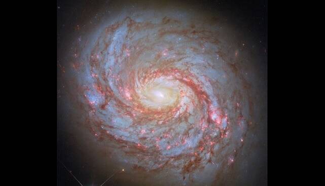 هسته فعال M77 در طول موجهای اشعه ایکس، فرابنفش، مرئی، فروسرخ و رادیویی میدرخشد. این عکس واضح و برجسته M77 که توسط تلسکوپ فضایی هابل گرفته شده است، جزئیات بازوهای مارپیچی را نشان میدهد که توسط ابرهای غبار به رنگ قرمز تیره و خوشههای ستارهای آبی در حال چرخش به دور مرکز درخشان و سفید کهکشان ردیابی شدهاند.
