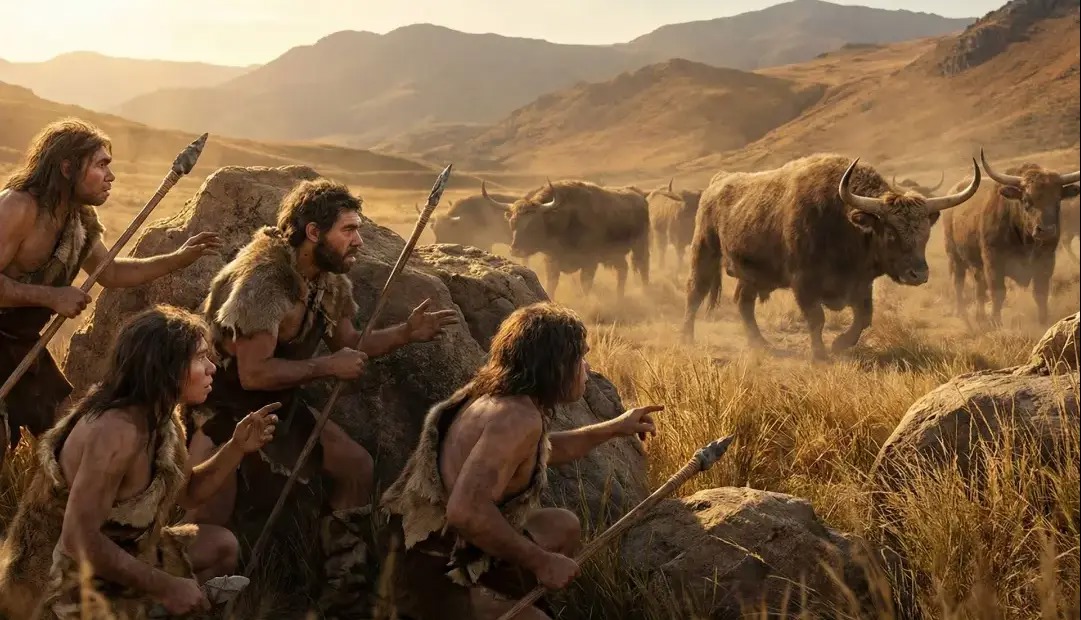 شکار موفقیتآمیز یک گله اروخص، گاوهای وحشی عظیمالجثهای که اکنون منقرض شدهاند، نیازمند هماهنگی و همکاری پیشرفته میان انسانهای باستانی بود. این سطح از مهارت سازمانی که تنها حدود ۵۰ هزار سال پیش گسترش یافت، به مثابه مزیتی تکاملی عمل کرد و ممکن است نقشی کلیدی در بقای انسان خردمند (Homo sapiens) و انقراض نئاندرتالها ایفا کرده باشد.