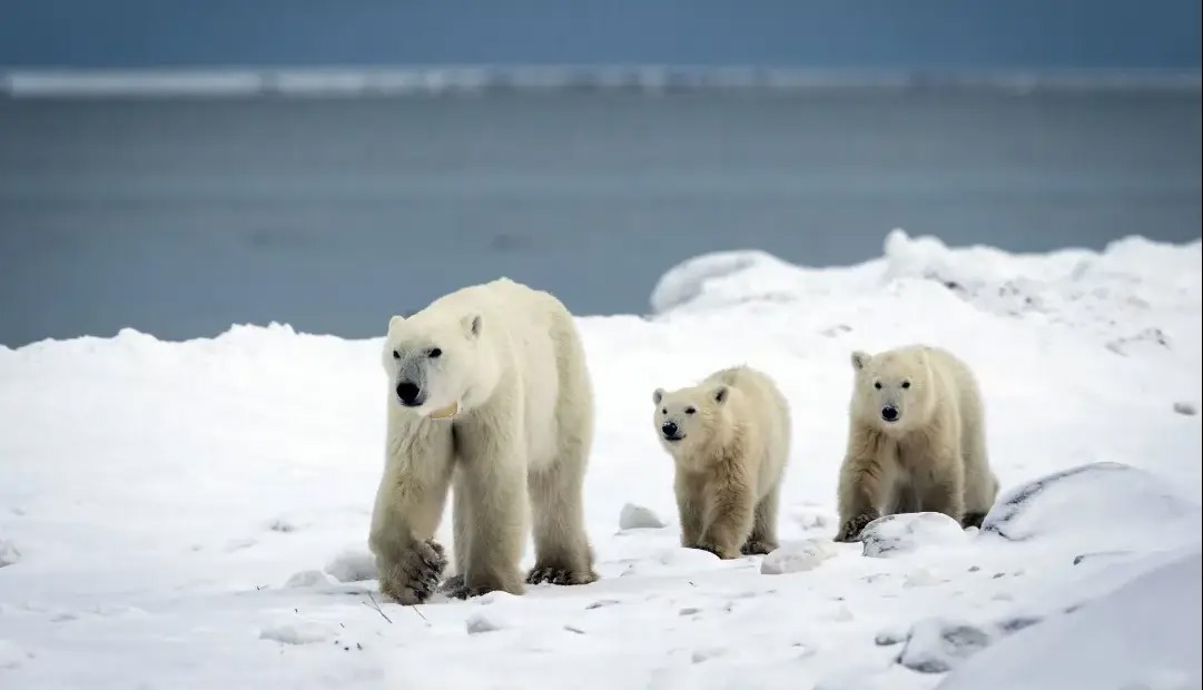 خرس مادر ۵ ساله به همراه دو تولهی ۱۰ تا ۱۱ ماهه، در جریان مهاجرت سالانه در نزدیکی شهر چرچیل در ایالت منیتوبا مشاهده شد.