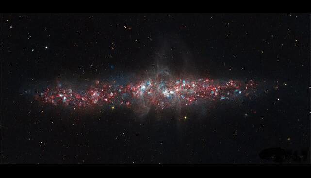 این نوردهی عمیق ۵۰ ساعته، هیدروژن درخشان را به رنگ قرمز و اکسیژن را به رنگ آبی در سراسر کهکشان «انجیسی ۵۵»(NGC 55) که تقریباً از لبه دیده میشود، برجسته میکند.