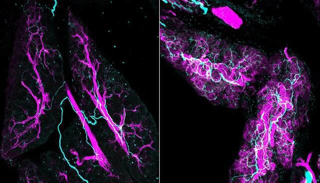 برای مشاهده این تعاملات، پژوهشگران از روشی به نام ایمنوفلورسانس تمامنمونه (whole-mount immunofluorescence) استفاده کردند که امکان ثبت تصاویر سهبعدی دقیق از ضایعات و سلولهای اطراف را فراهم میکند. در تصاویر دوبعدی سنتی، رشتههای عصبی به صورت نقاط پراکنده کوچک دیده میشوند. اما تصاویر سهبعدی داستان کاملاً متفاوتی را نشان دادند: شبکهای ضخیم و بههمپیوسته از اعصاب که در سراسر ضایعات تنیده شده و به دور myCAFs پیچیدهاند.