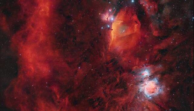ستارههای صورت فلکی «شکارچی»(Orion) در میان گاز هیدروژن سرخرنگ به دنیا میآیند. این مهدهای ستارهای در لبه مجموعه بزرگ ابر مولکولی شکارچی در فاصله حدود ۱۵۰۰ سال نوری از زمین قرار دارند.
